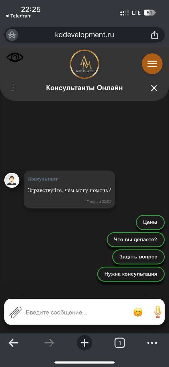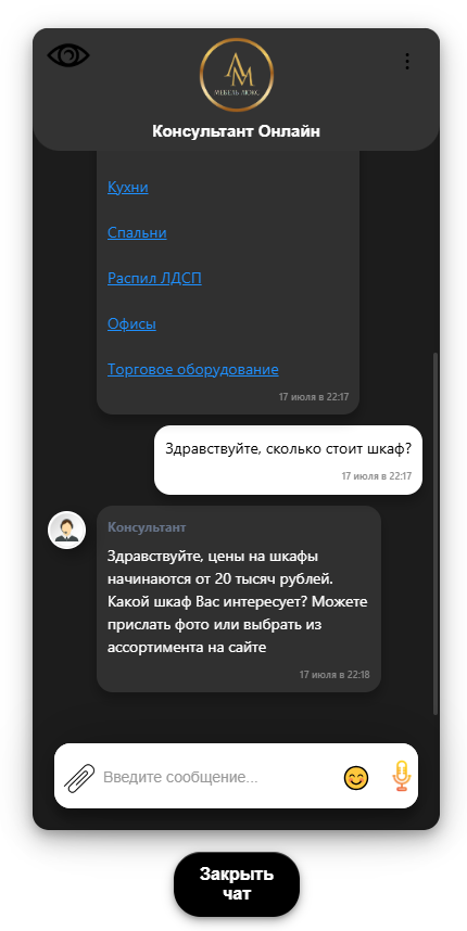 Разработка онлайн-чата для сайта Заказатьмебель.рф
