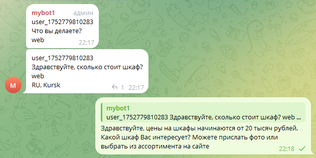 Пользователь присылает сообщение на сайте - Сообщение приходит вам в Телеграм - Вы отвечаете из Телеграма - сообщение приходит пользователю в чат на сайте